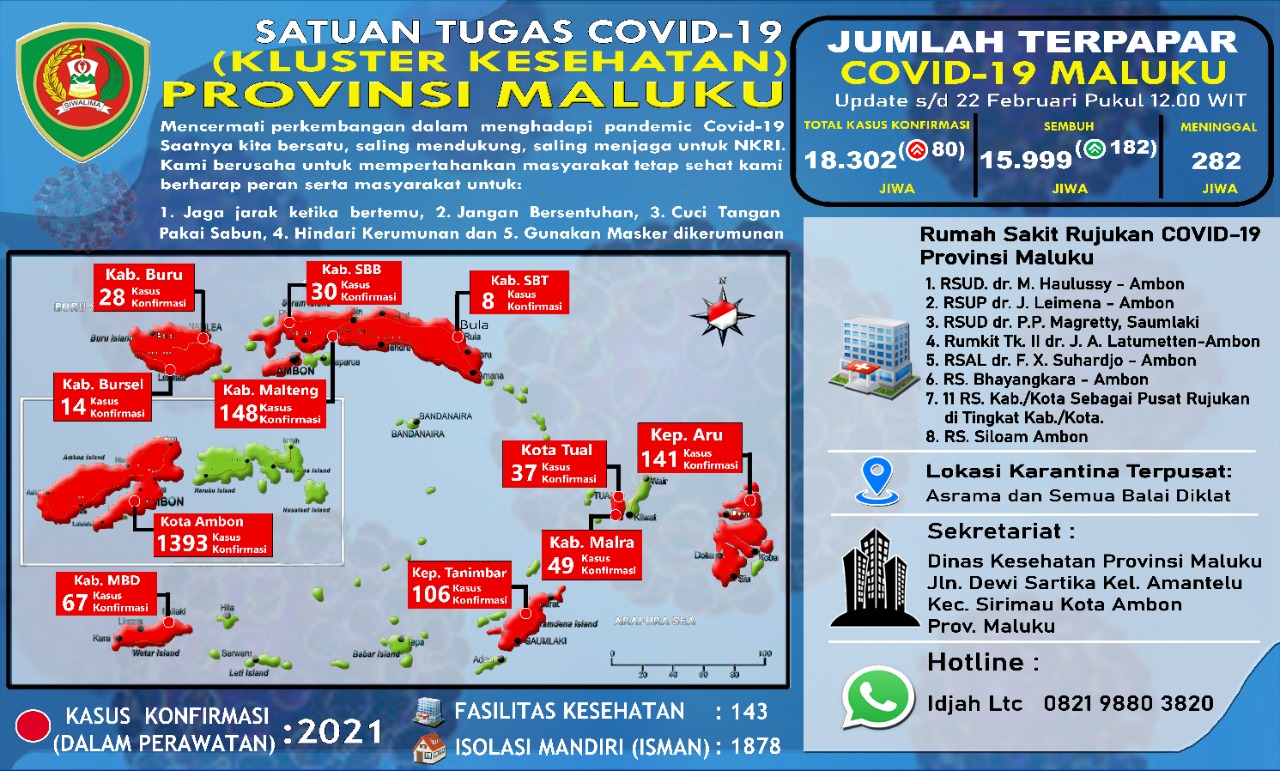 Dengan demikian, hingga 22 Pebruari 2022, total kasus konfirmasi di Maluku bertambah menjadi 18.302 kasus, sembuh 15.999 pasien. Saat ini jumlah pasien tercatat  untuk Kota Ambon 1393 kasus, Kabupaten Maluku Tengah 148 kasus, SBB 30 kasus, Buru 28 Kasus ,Bursel 14 kasus.