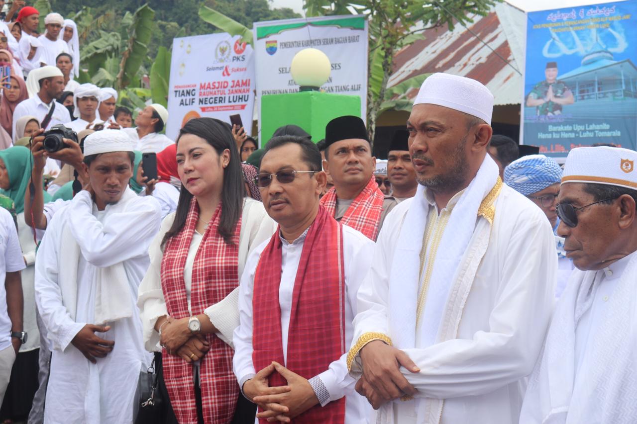 Ambon – Suaratmurnews.com Wakil Gubernur Maluku Barnabas Natanhiel Orno bersama isteri, Beatrix Orno Soumeru, menghadiri Pemancangan Tiang Alif Masjid Jami Negeri Luhu, Kabupaten Seram Bagian Barat (SBB), Senin, (26/9/2022).
