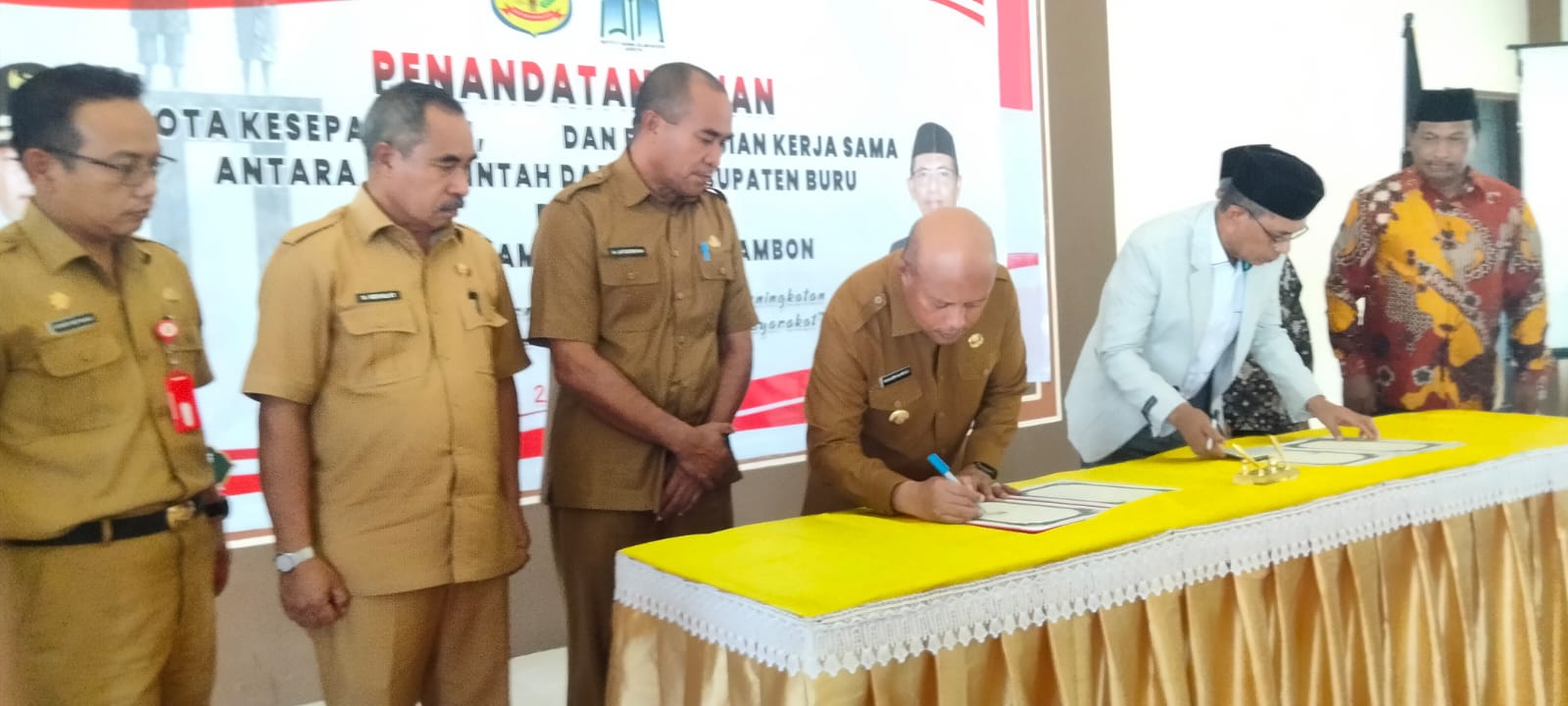 Namlea,-Suaratimurnewscom Pj Bupati Kabupaten Buru, DR Jalaluddin Salampessy, S.Pi,SH, M.Si, bersama rektor Institut Agama Islam Negeri (IAIN) Ambon, DR Zainal Abidin Rahwarin, didampingi Direktur pasca sarjana IAIN Ambon, Prof DR La Jamaa,M.Hi, melakukan penandatanganan pada bidang pendidikan pasca sarjana berlangsung di Lantai II Aula Kantor Badan Kepegawaian dan Pengembangan SDA di Namlea, Ibukota Kabupaten Buru Selasa 20/12 Tahun 2022.