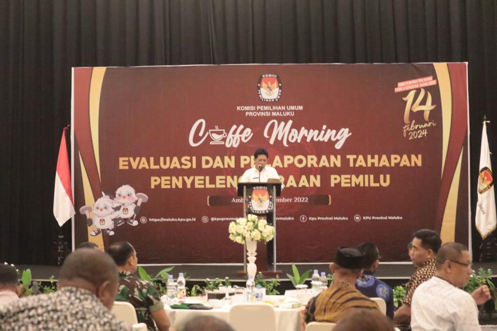 Ambon -Suaratimurnewscom KPU Maluku menyelenggarakan Coffe Morning tentang Evaluasi dan Pelaporan Tahapan Penyelenggaraan Pemilu di lantai V Hotel Santika, Jumat, (30/12/2022).