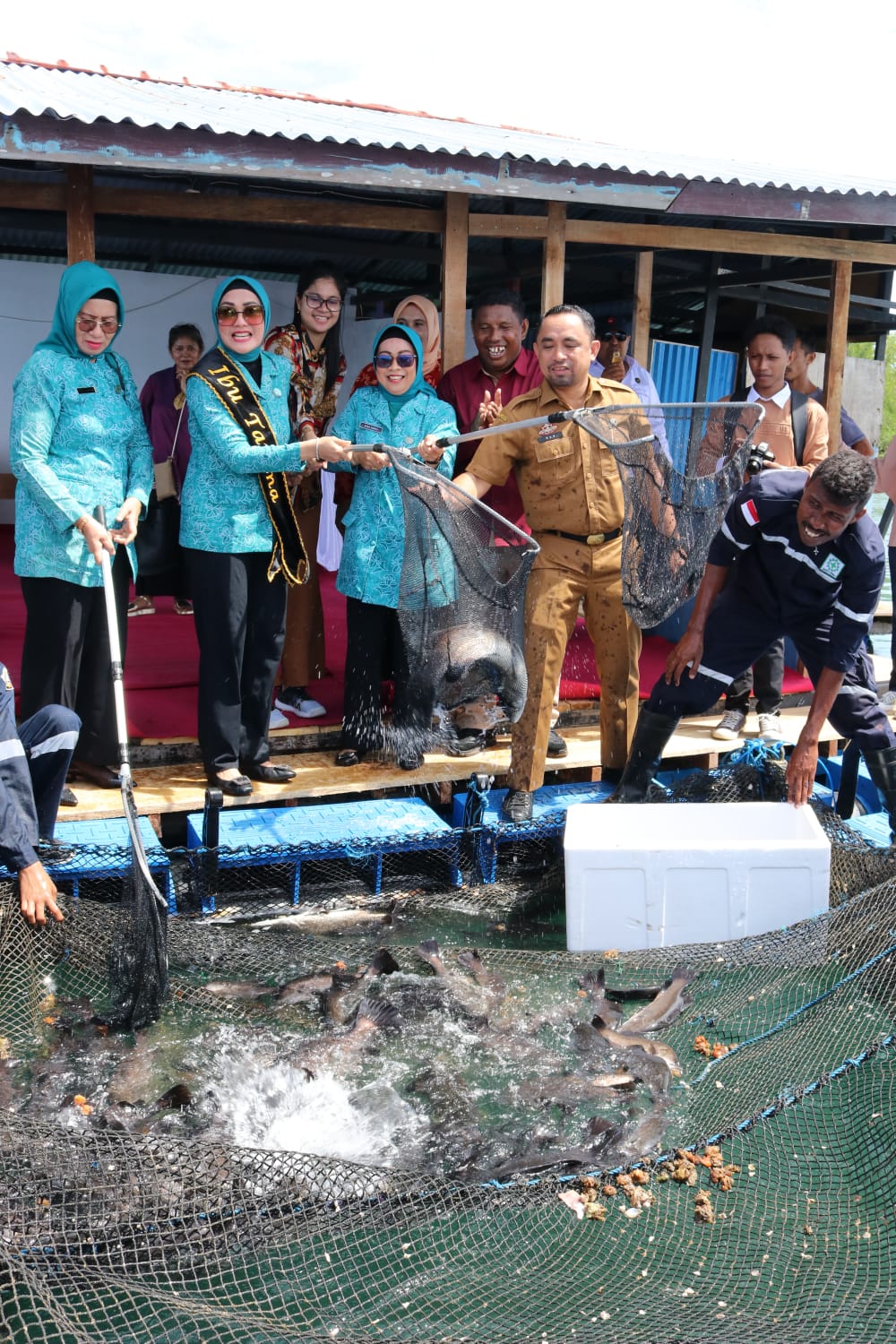 Ambon-Suaratimurnewscom – Ketua TP PKK Provinsi Maluku, Widya Pratiwi Murad, melakukan panen budidaya ikan sistem keramba jaring apung, Selasa (31/1/23) di Kampus SUPM/Politeknik Kelautan dan Perikanan Maluku, Waiheru, Kecamatan Baguala, Kota Ambon.