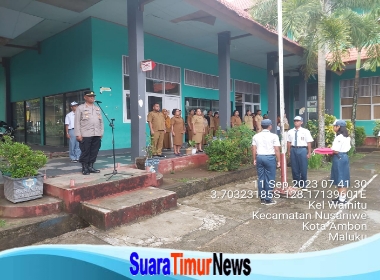 Polresta P.Ambon & P.P Lease -Suaratimurnewscom Kapolsek Nusaniwe Iptu John Anakotta, bersama dengan Bhabinkamtibmas kel Wainitu Aipda R.Soplanit , memimpin upacara bendera sekaligus Melaksanakan Kegiatan Basudara Manise (Safari Kamtibmas) di SMK Neg 7 Ambon.