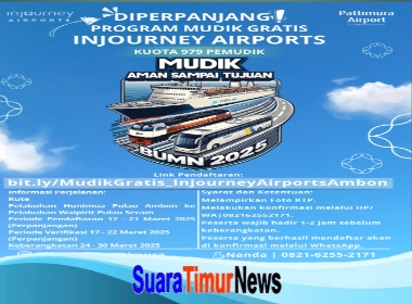 Ambon, –Suaratimurnews.com Program Mudik Gratis 2025 Bersama Injourney Airports di yang akan dilaksanakan pada 24 – 30 Maret 2025, memberikan waktu tambahan kepada masyarakat Provinsi Maluku khususnya Masyarakat Kota Ambon yang berencana melakukan Mudik Lebaran 1446 H ke Pulau Seram menggunakan moda transportasi Kapal Ferry.